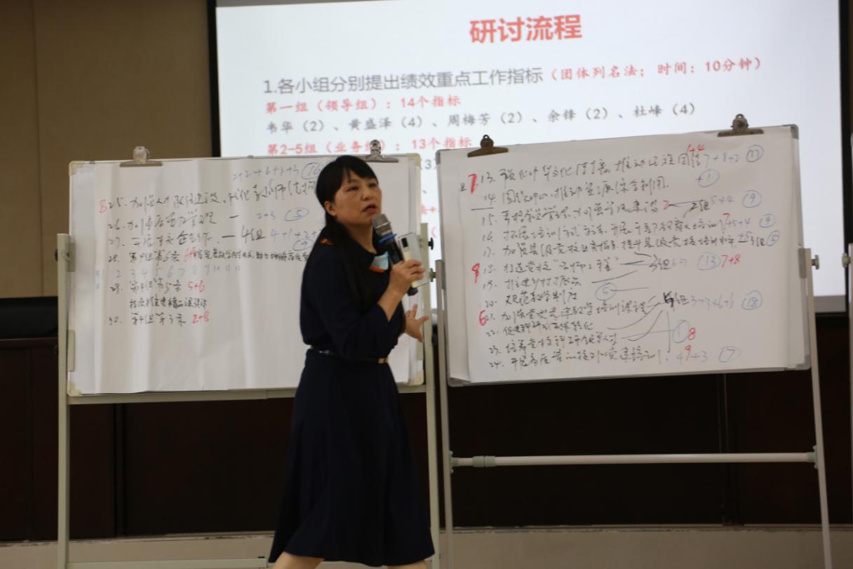 在随后开展的行动学习中,5个小组在促进师的引导下,运用团体列名法提出对我校2022年重点工作指标的意见,各小组在研讨中共提出26个指标名称,然后通过投票筛选出9个指标名称,为最终确定我校年度绩效重点工作指标提供了初步意见。